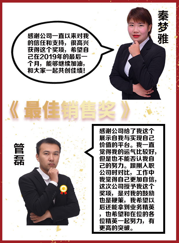大會上,岳總經理還宣讀11月份先進個人名單:業務一部胡雪成,業務二部秦夢雅,采購部曹鳳勤,市場部葛格。他們在11月份評比中表現突出,成績斐然,希望他們發揮模范帶頭作用,在今后工作中再創佳績。同時,岳經理表示達成11月業績目標離不開每一位員工的努力,勉勵大家再接再厲,期待更多人加入精英隊伍。