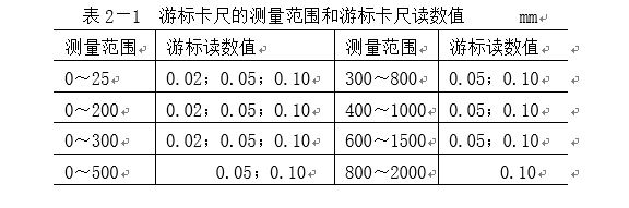 目前我國生產的游標卡尺的測量范圍及其游標讀數值見表2-1。